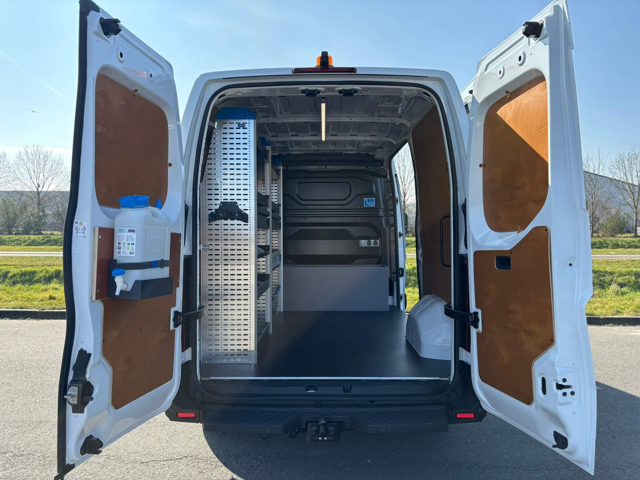 Verder is de bus uitgerust met een handige watertapset aan de achterdeur en een slanghaspel in de laadruimte — ideaal voor gebruik op locatie.