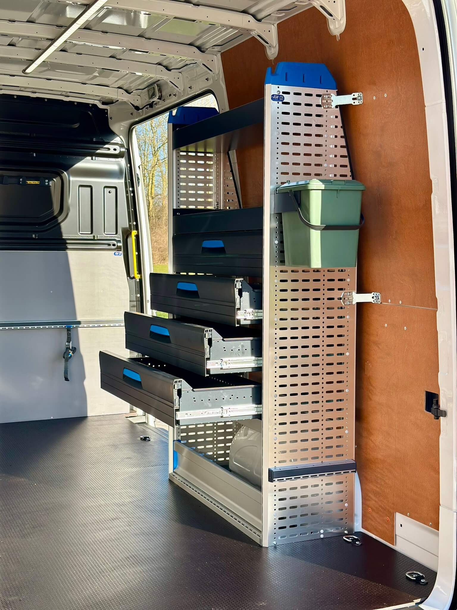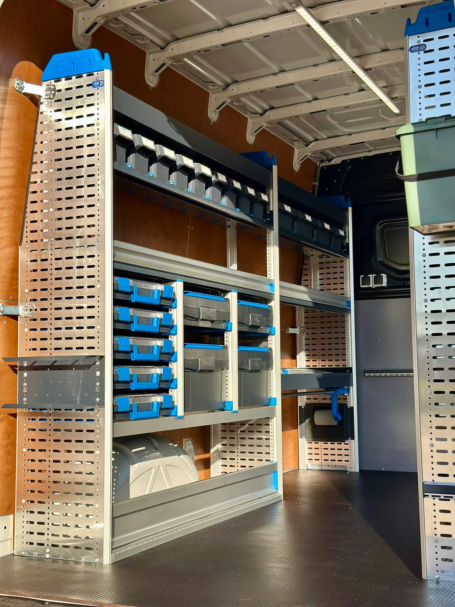 De laadruimte is voorzien van een overzichtelijke bedrijfswageninrichting aan zowel de linker- als rechterzijde. De Sortimo opstellingen bieden ruimte aan voorraadartikelen, gereedschap en koffers, met diverse opbergmogelijkheden zoals schuiflades, Boxxen en verdeelvakken. Door de overzichtelijke indeling en duidelijke labeling is elk onderdeel snel terug te vinden – ook tijdens storingen of gepland onderhoud.