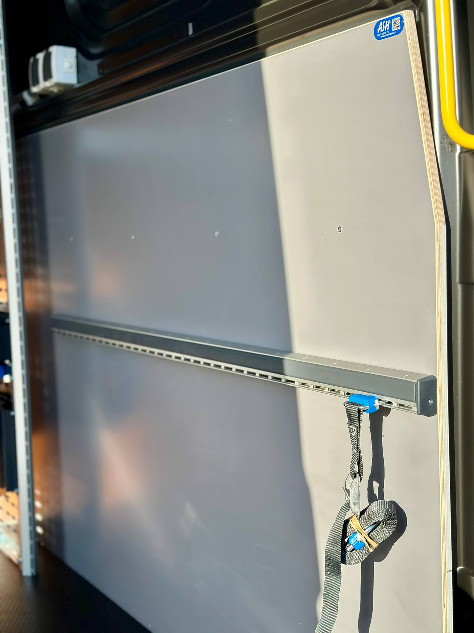 In de laadruimte is een betonplex plaat aangebracht tegen de tussenwand, waarop spanbandrails zijn gemonteerd. Hiermee kunnen grotere materialen of machines veilig vastgezet worden tijdens het rijden. Aan de bovenzijde is een hakenstrip geplaatst voor extra ophangmogelijkheden. De LED-verlichting met bewegingssensor zorgt voor goed zicht onder alle omstandigheden, terwijl de geïntegreerde stroomvoorziening mobiel werken mogelijk maakt.