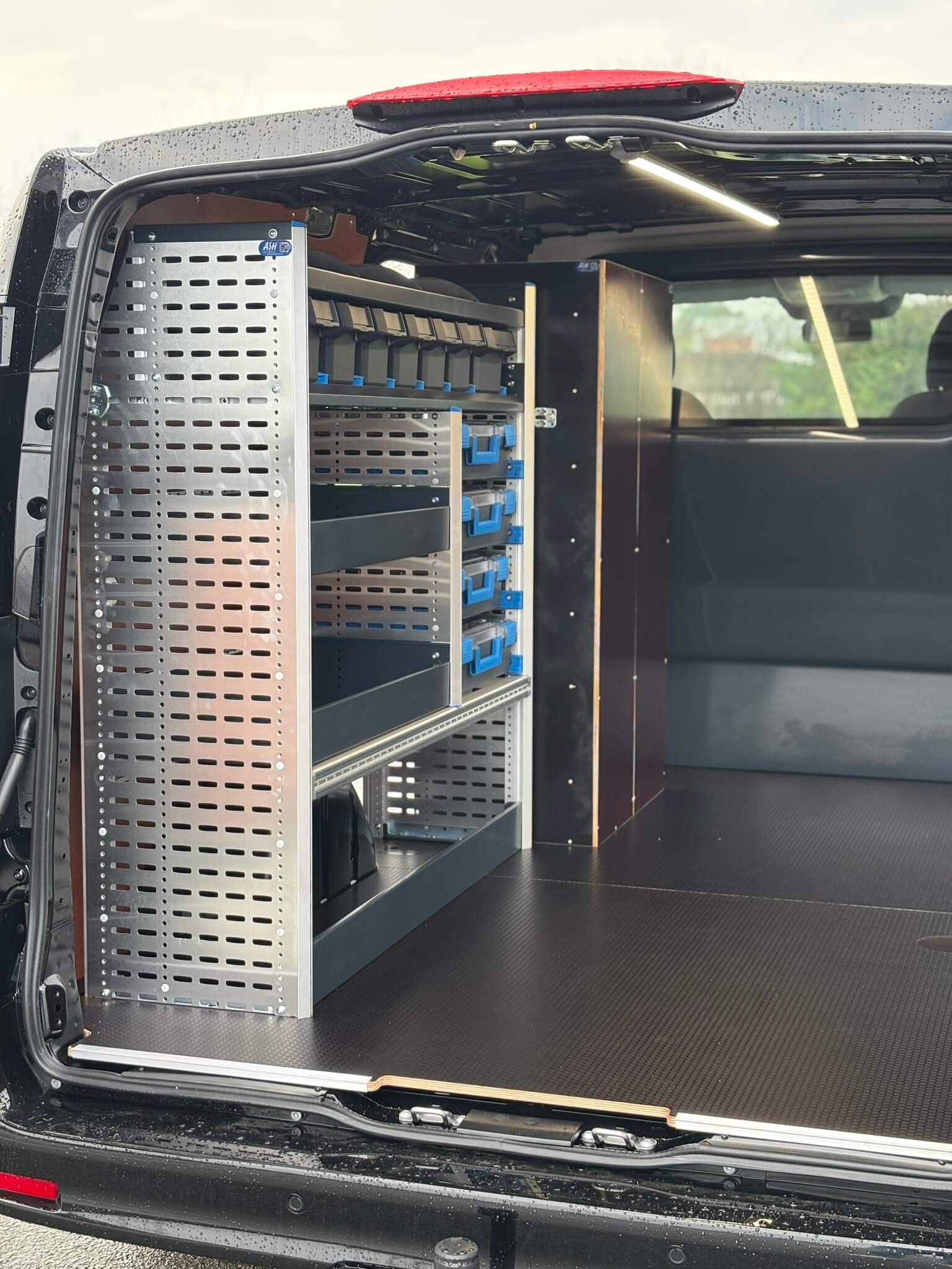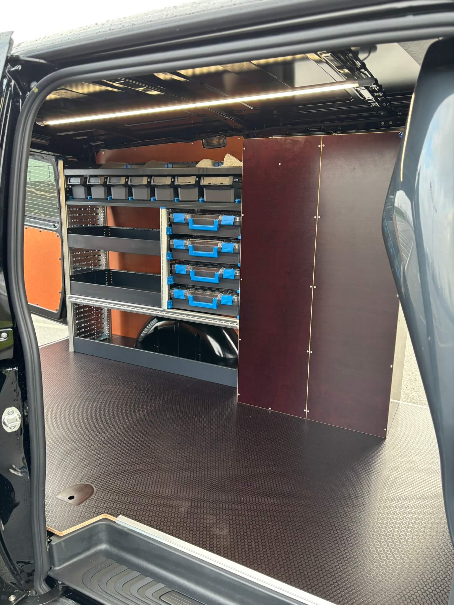De laadruimte is afgewerkt met een 12 mm betonplex vloerplaat met sjorogen en instaplijsten. De wanden zijn eveneens voorzien van betimmering, inclusief afwerking van de schuif- en achterdeuren. Tegen de linkerzijde is een Sortimo bedrijfswageninrichting geplaatst met schuiflades, legborden, SR- en T-Boxxen en een op maat gemaakt legvak.