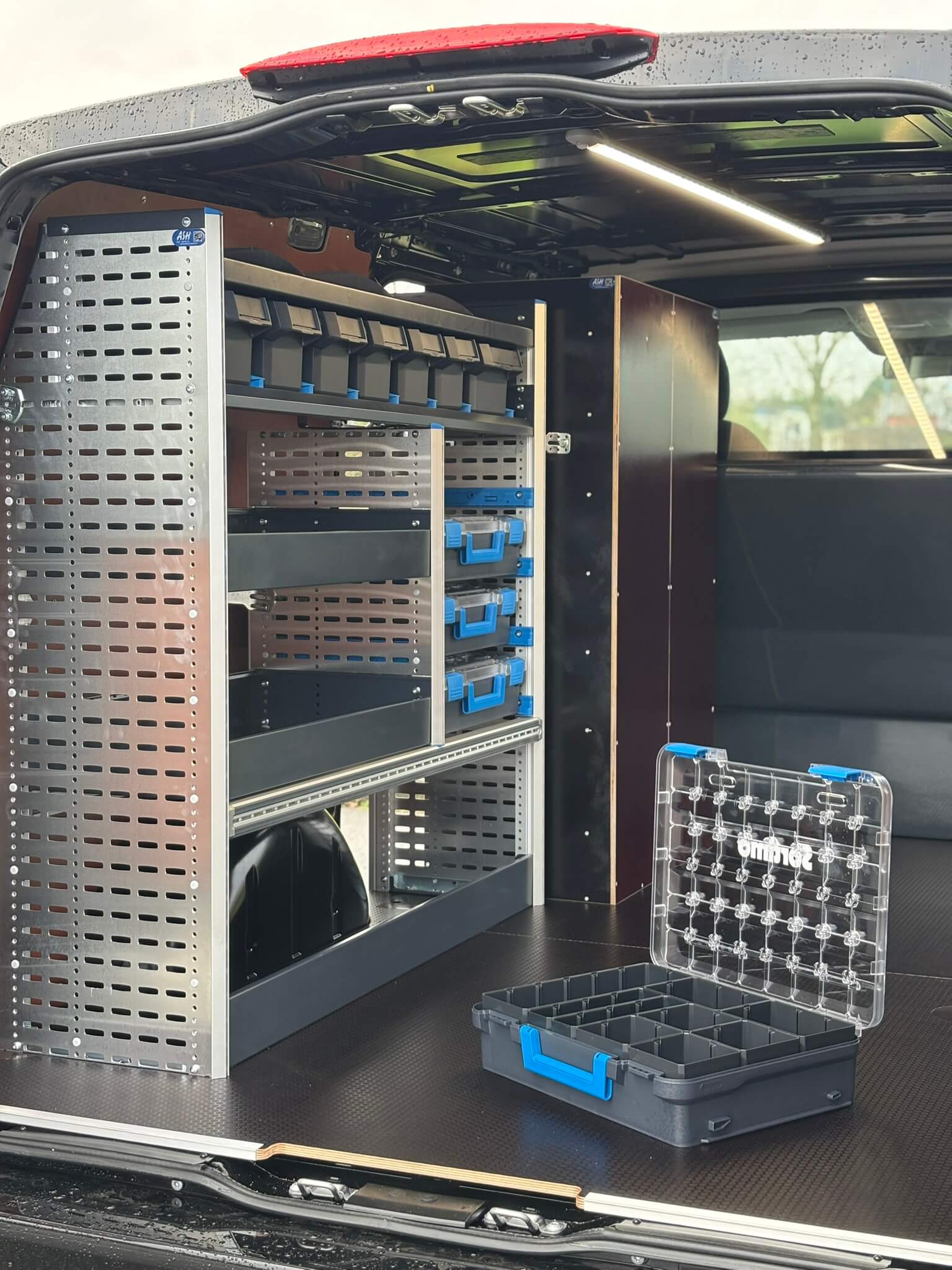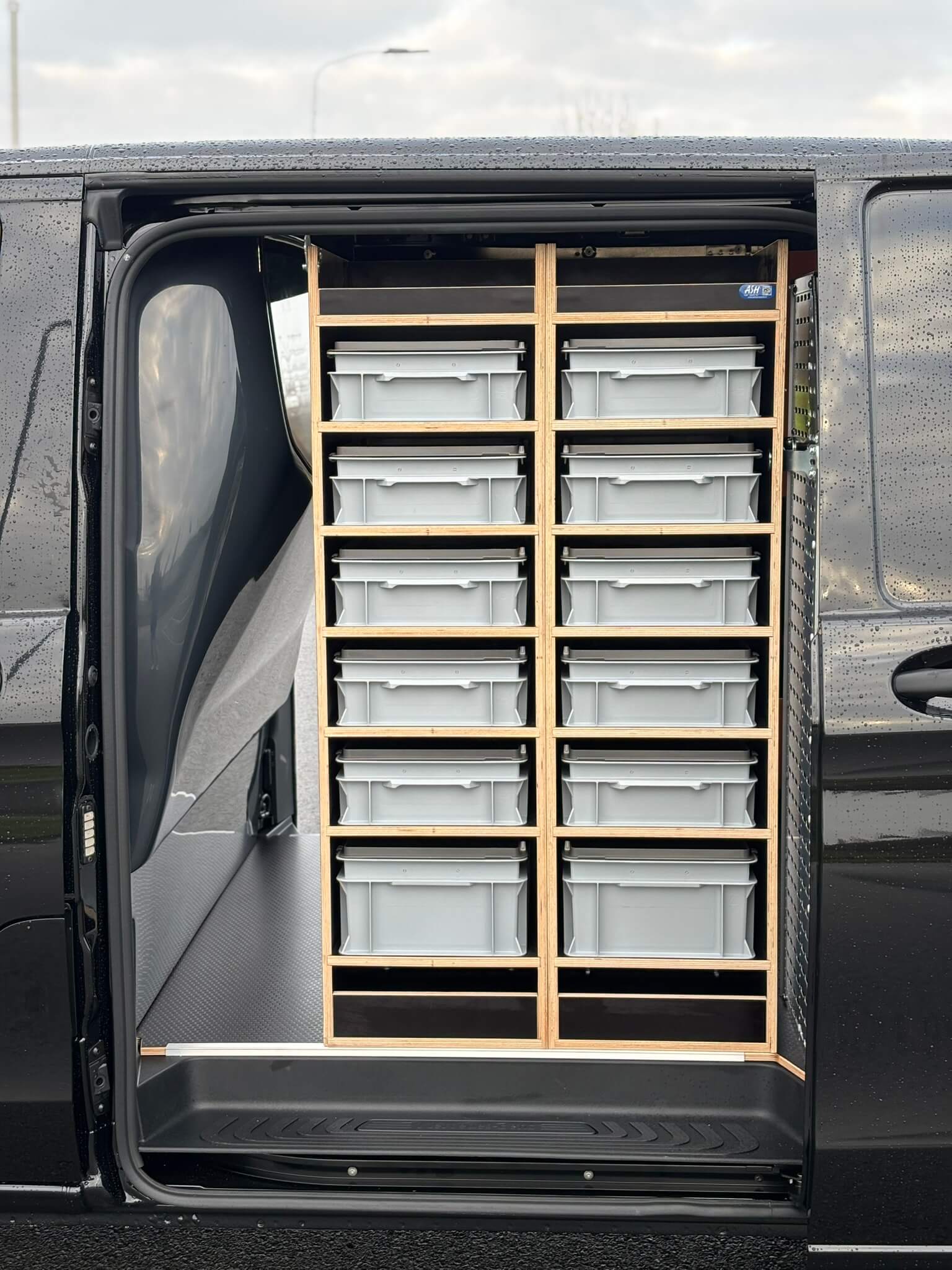 Daarnaast is in het schuifdeurdeel een maatwerkopstelling van betonplex geplaatst, met ruimte voor maar liefst 12 kisten. Deze kisten zorgen ervoor dat materiaal veilig en overzichtelijk opgeborgen is, ook tijdens transport.