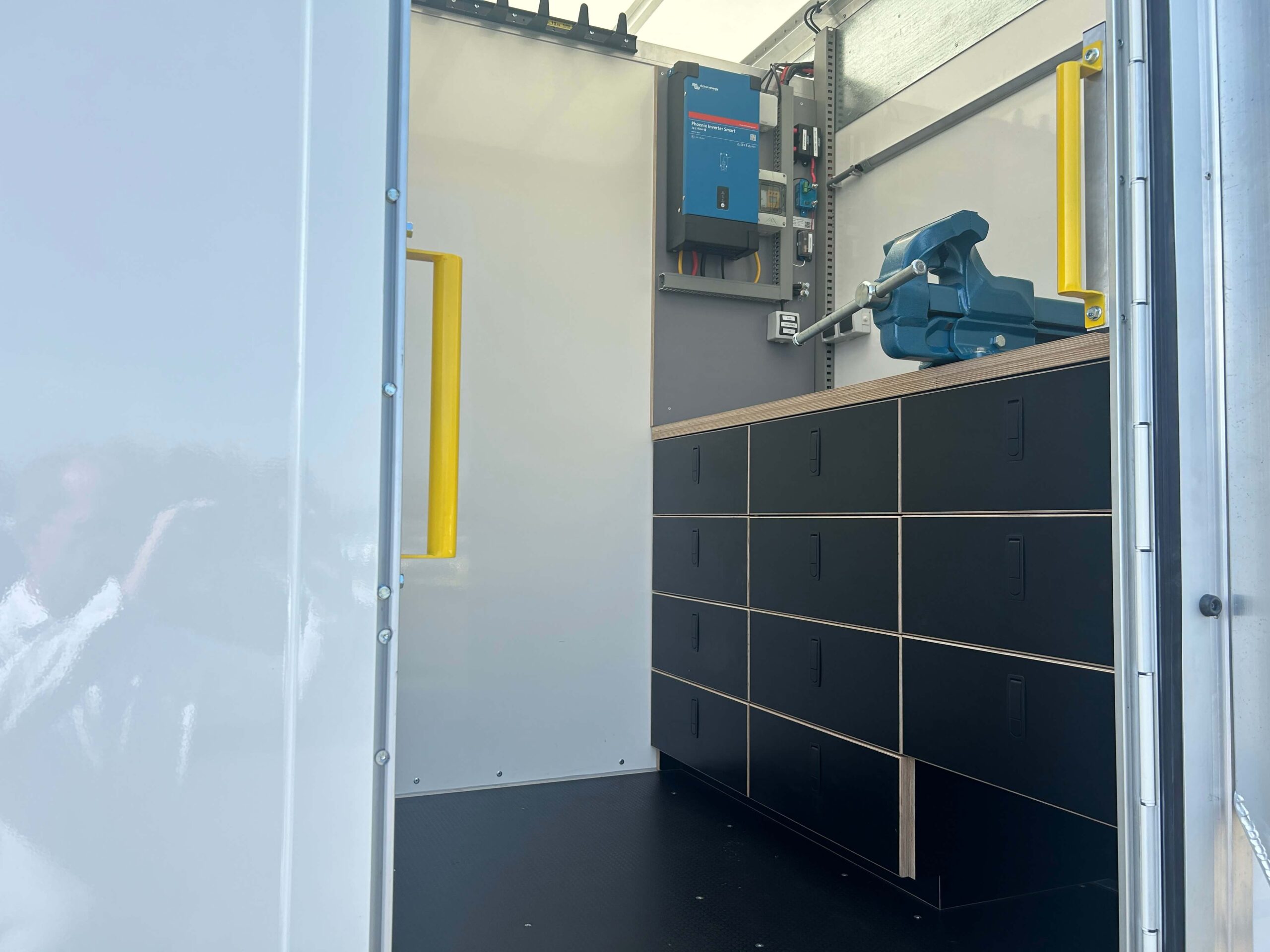 Aan de voorzijde van de laadruimte is een werkbank geplaatst, opgebouwd uit bruin betonplex. Deze bevat elf lades met houten front, elk voorzien van ladegeleiders en sloten. In één vak is bewust ruimte gelaten om flexibel in te delen. De bankschroef is stevig gemonteerd op de hoek van het werkblad, zodat nauwkeurige bewerkingen direct op locatie uitgevoerd kunnen worden.