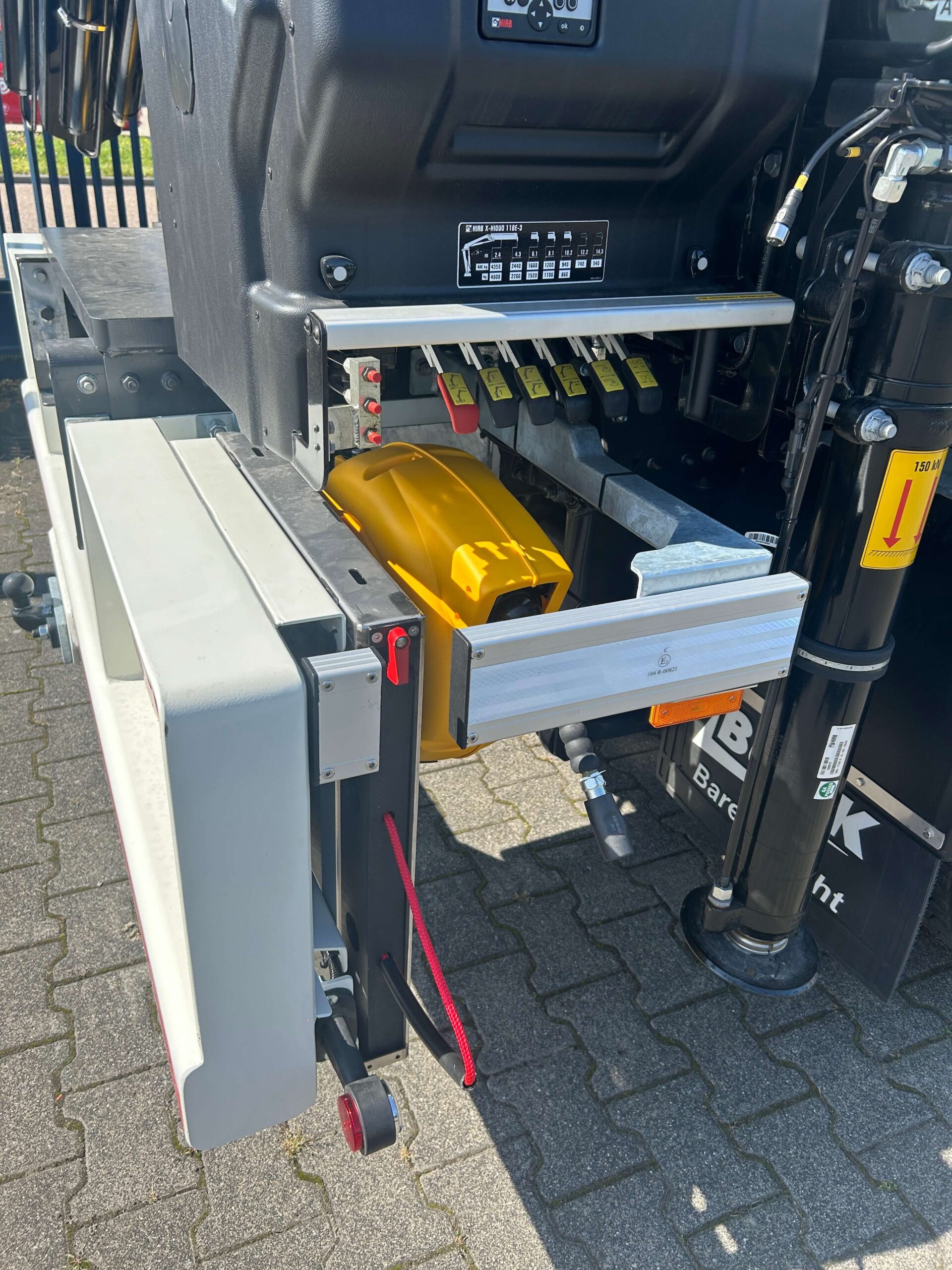 Aan de zijwanden zijn twee hakenstrips van Sortimo gemonteerd, ideaal voor het ophangen van vaak gebruikte tools. Twee gele handgrepen zorgen voor extra veiligheid bij het instappen. Tot slot is ook een luchthaspel aan de buitenzijde gemonteerd.