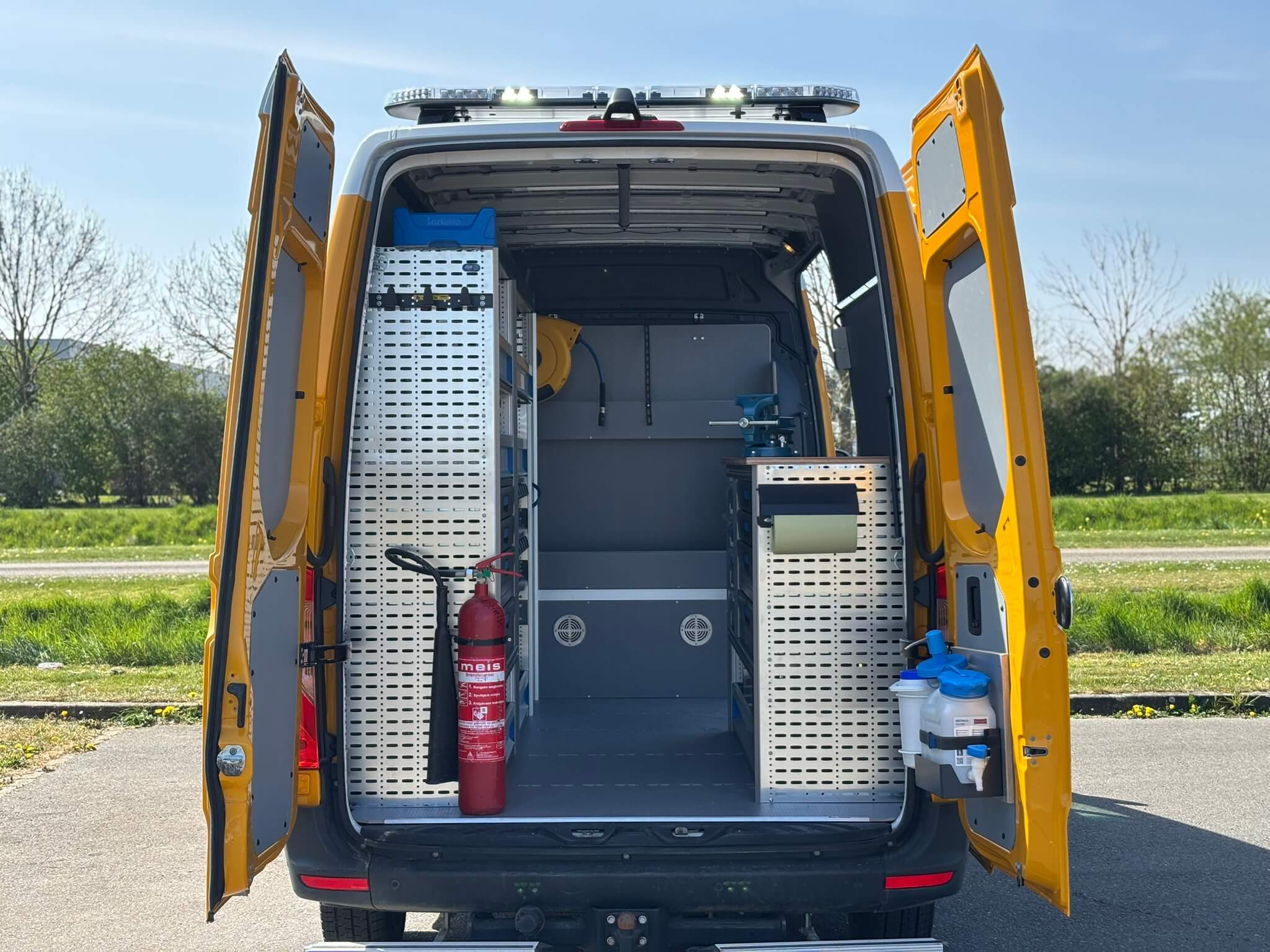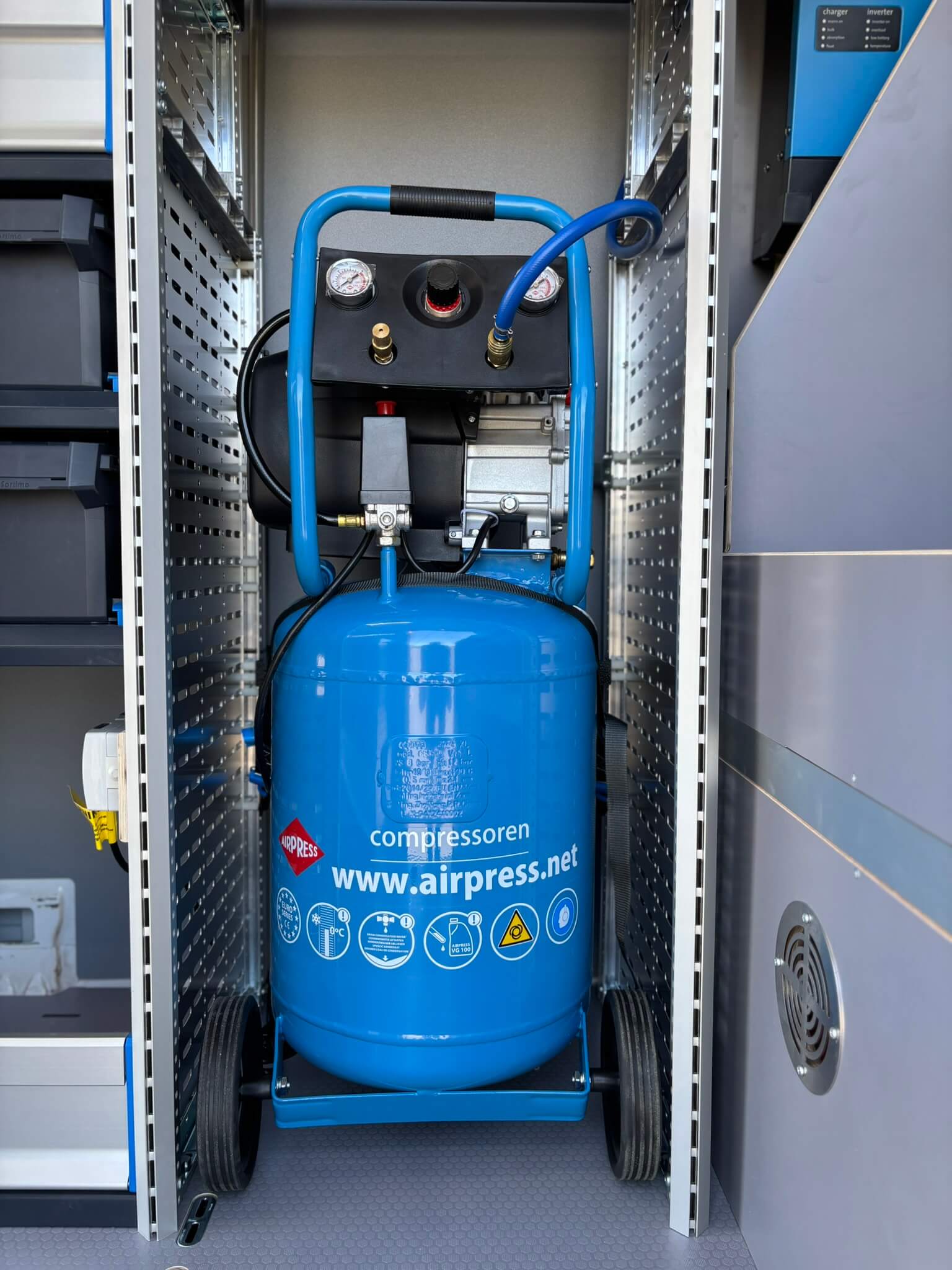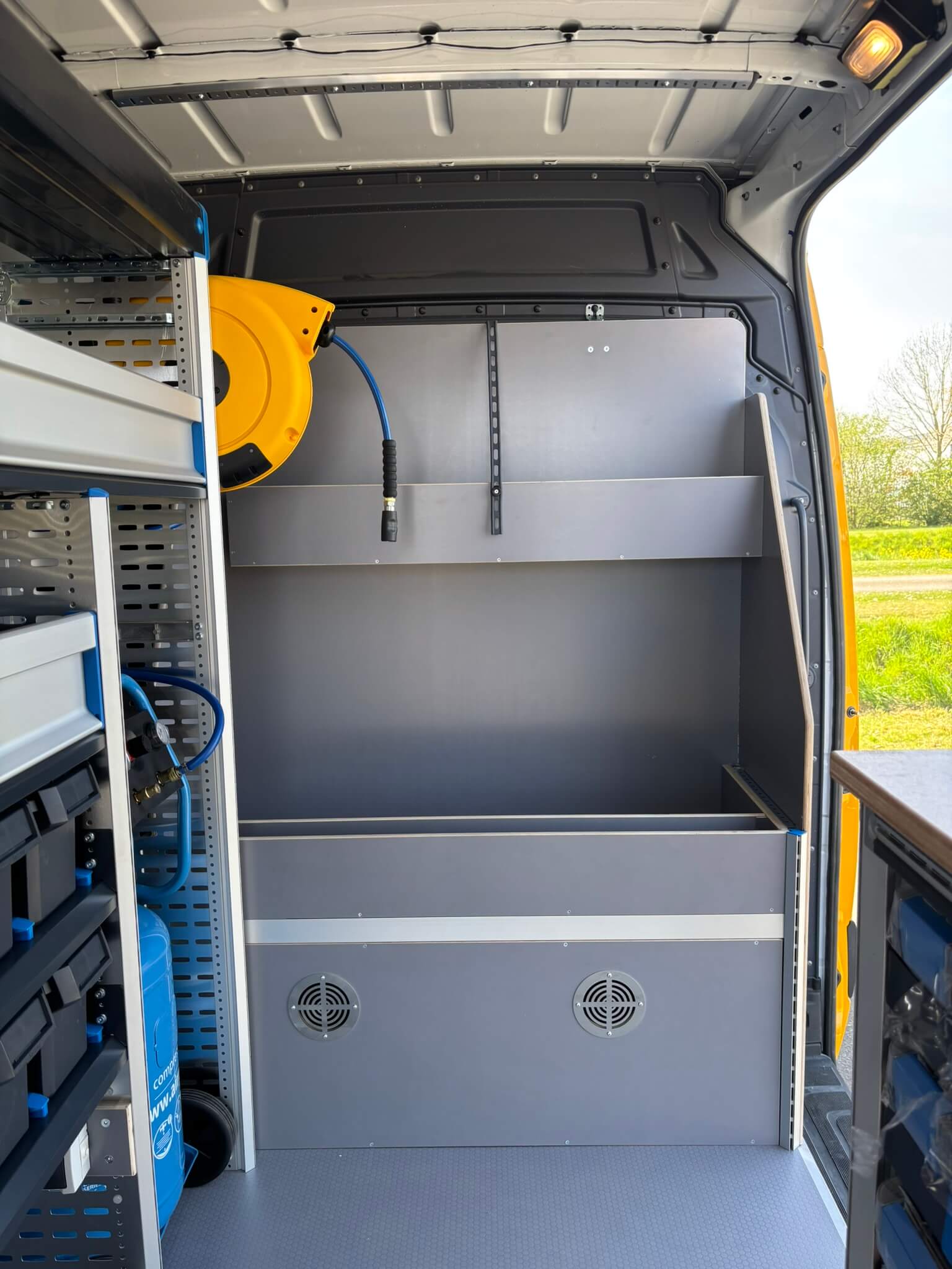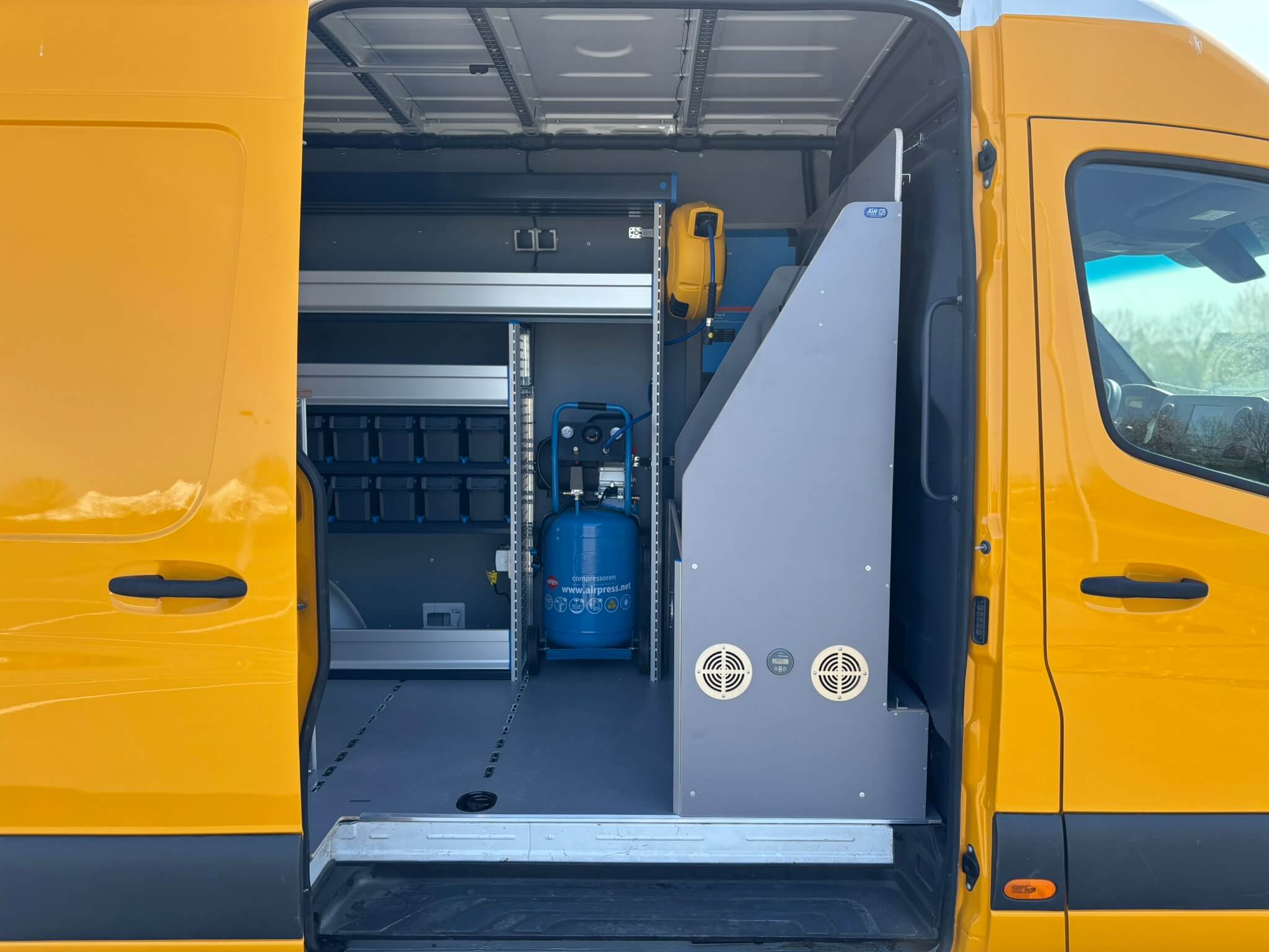 Voor werkzaamheden waarbij perslucht nodig is, is een compressor geïntegreerd in de inrichting aan de linkerzijde. In combinatie met een luchthaspel is perslucht snel beschikbaar. Ook zijn er extra Prosafe montagerails tegen het dak geplaatst en spanstangen toegevoegd, zodat grotere items veilig vastgezet kunnen worden en de bus tijdens het rijden netjes op orde blijft.