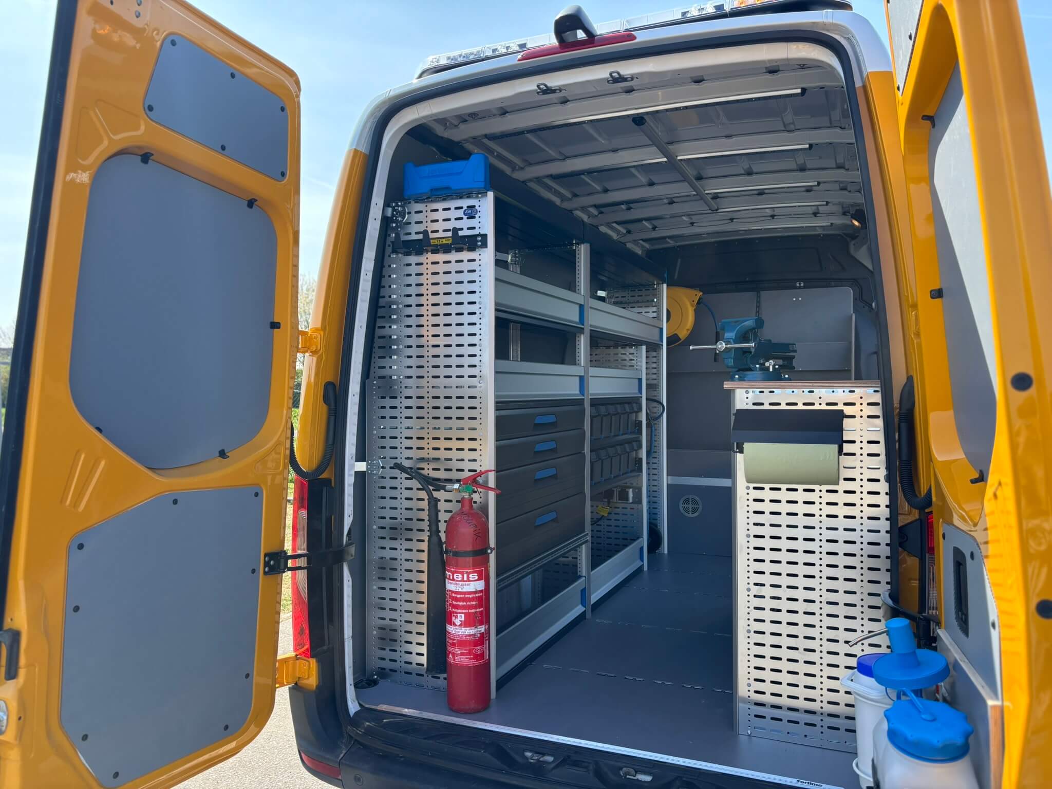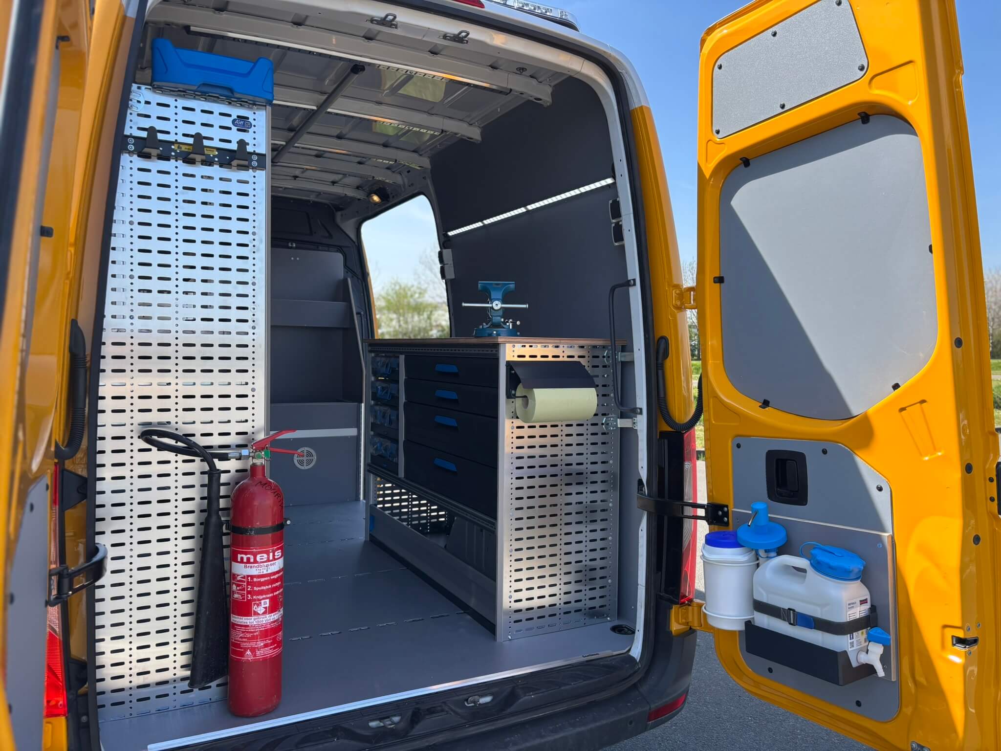 Omdat je op locatie soms lang bezig bent, is er een compact hygiënepakket opgenomen met water- en zeepvoorziening op de rechter achterdeur. De papierrolhouder is geplaatst aan de zijkant van de werkbank, zodat alles logisch binnen handbereik zit en de laadruimte praktisch blijft ingericht voor dagelijks gebruik.