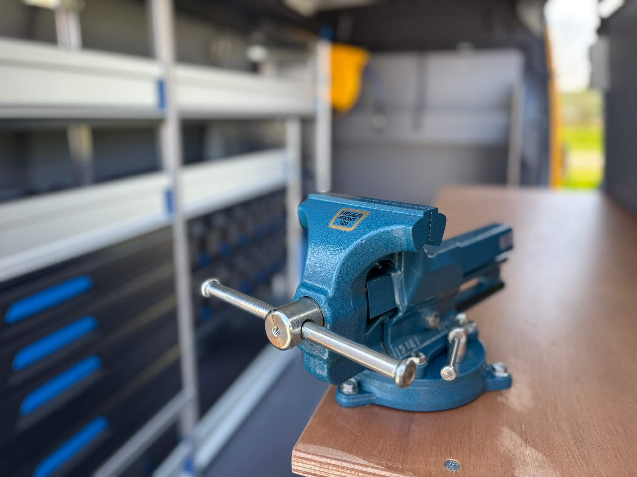 Aan de rechterzijde is een werkbank opgenomen met bankschroef. Boven en rondom de werkbank zijn meerdere aansluitpunten voorzien, zodat apparatuur kan worden ingeplugd zonder verlengsnoeren door de hele laadruimte.