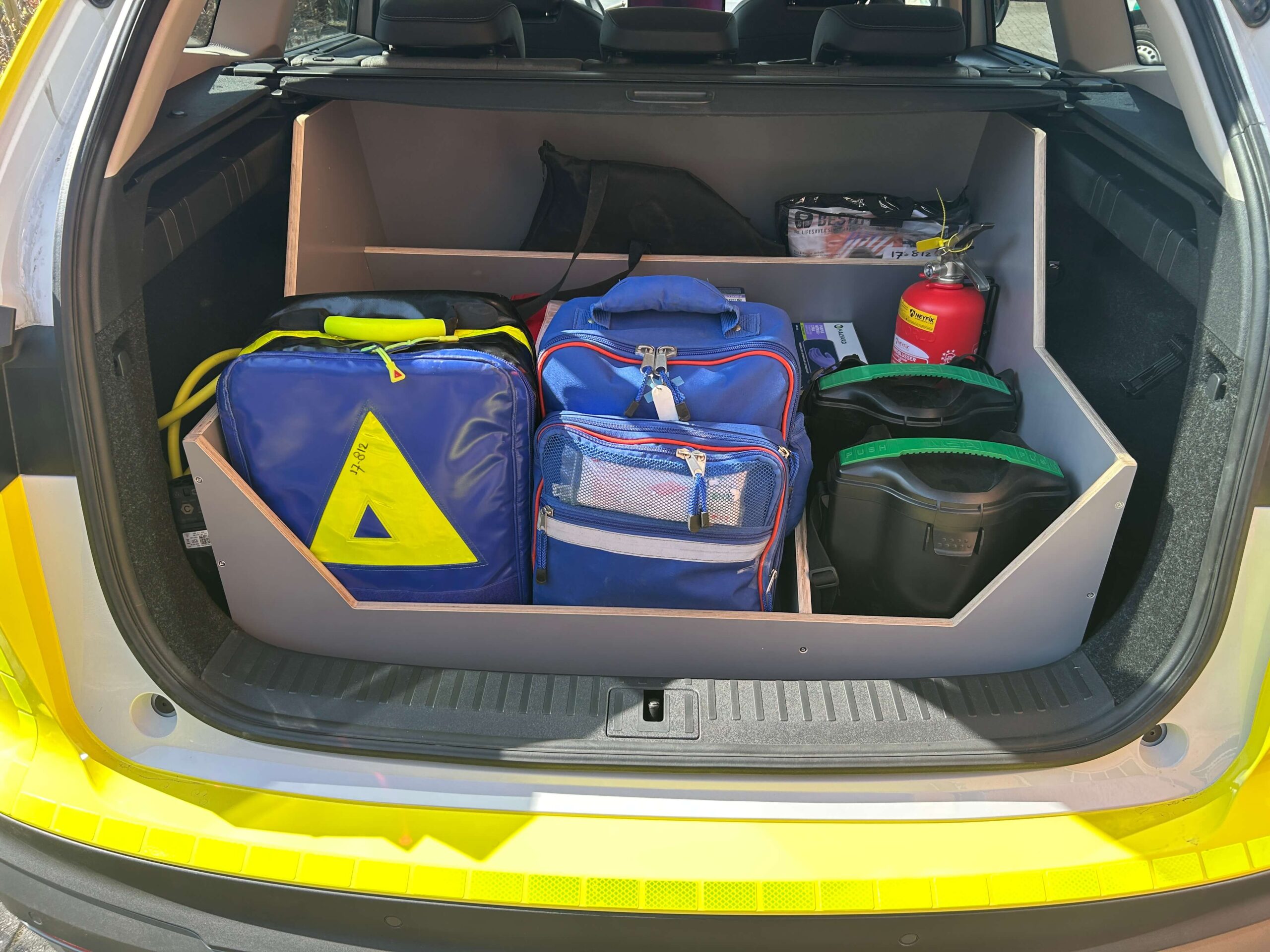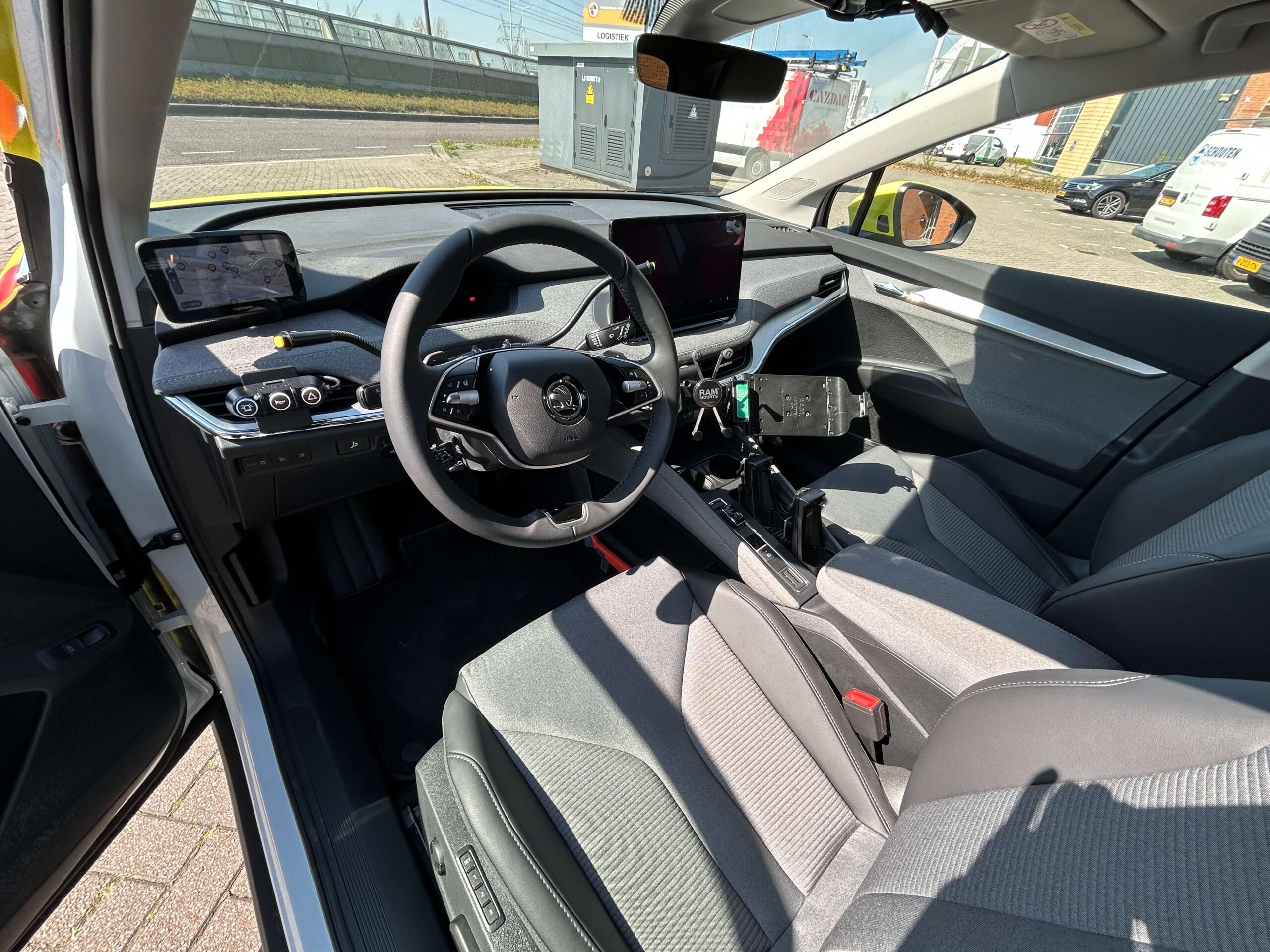 Voor de Veiligheidsregio Rotterdam-Rijnmond is deze Skoda Enyaq ingericht als OVD-G voertuig. OVD-G staat voor Officier van Dienst Geneeskundig. In die rol moet je onderweg én op locatie snel kunnen schakelen, overzicht houden en veilig kunnen werken. De inrichting is daarom afgestemd op duidelijke bediening, goede zichtbaarheid tijdens prioriteitsritten en een nette, vaste plek voor middelen in cabine en laadruimte.