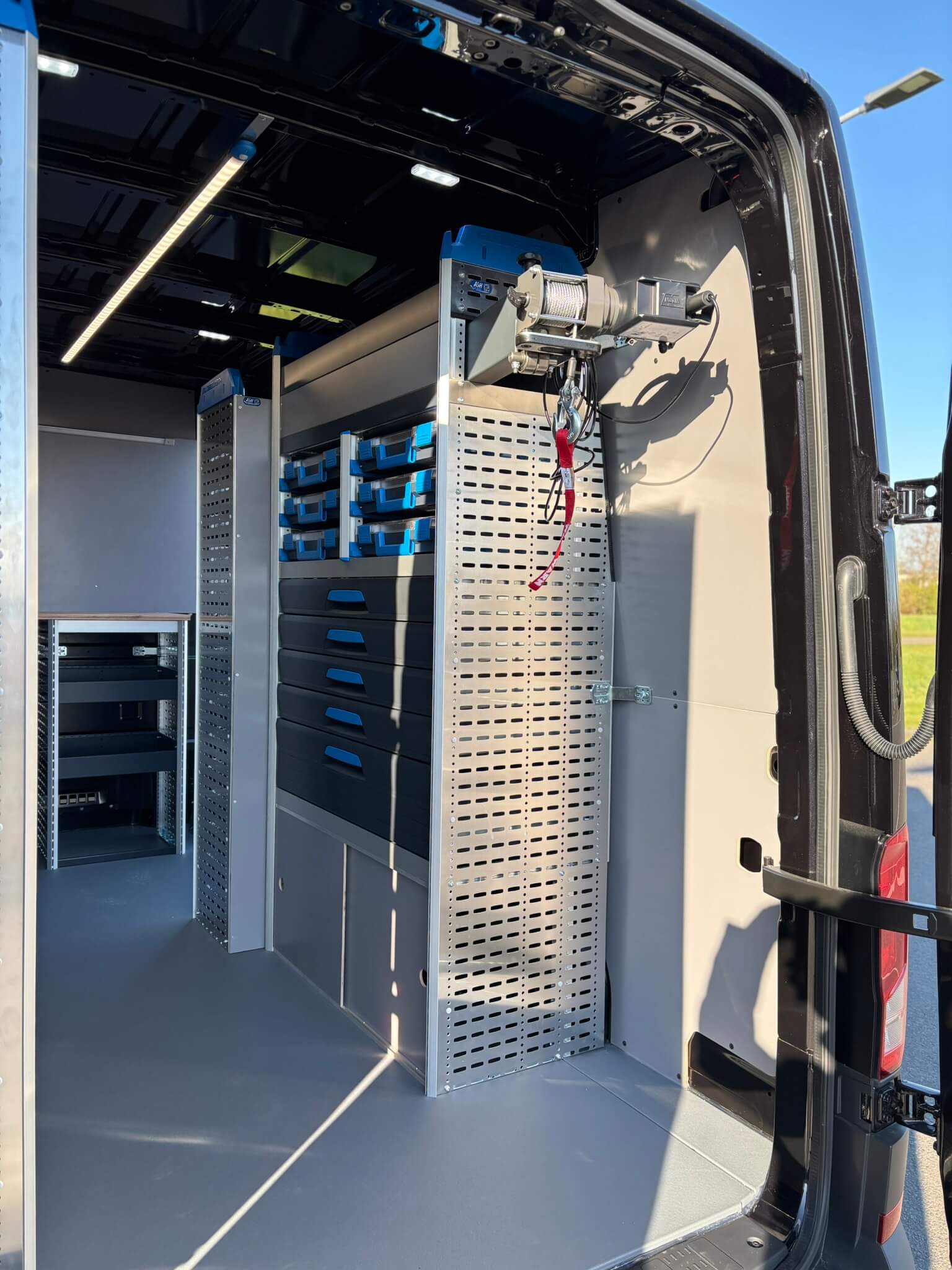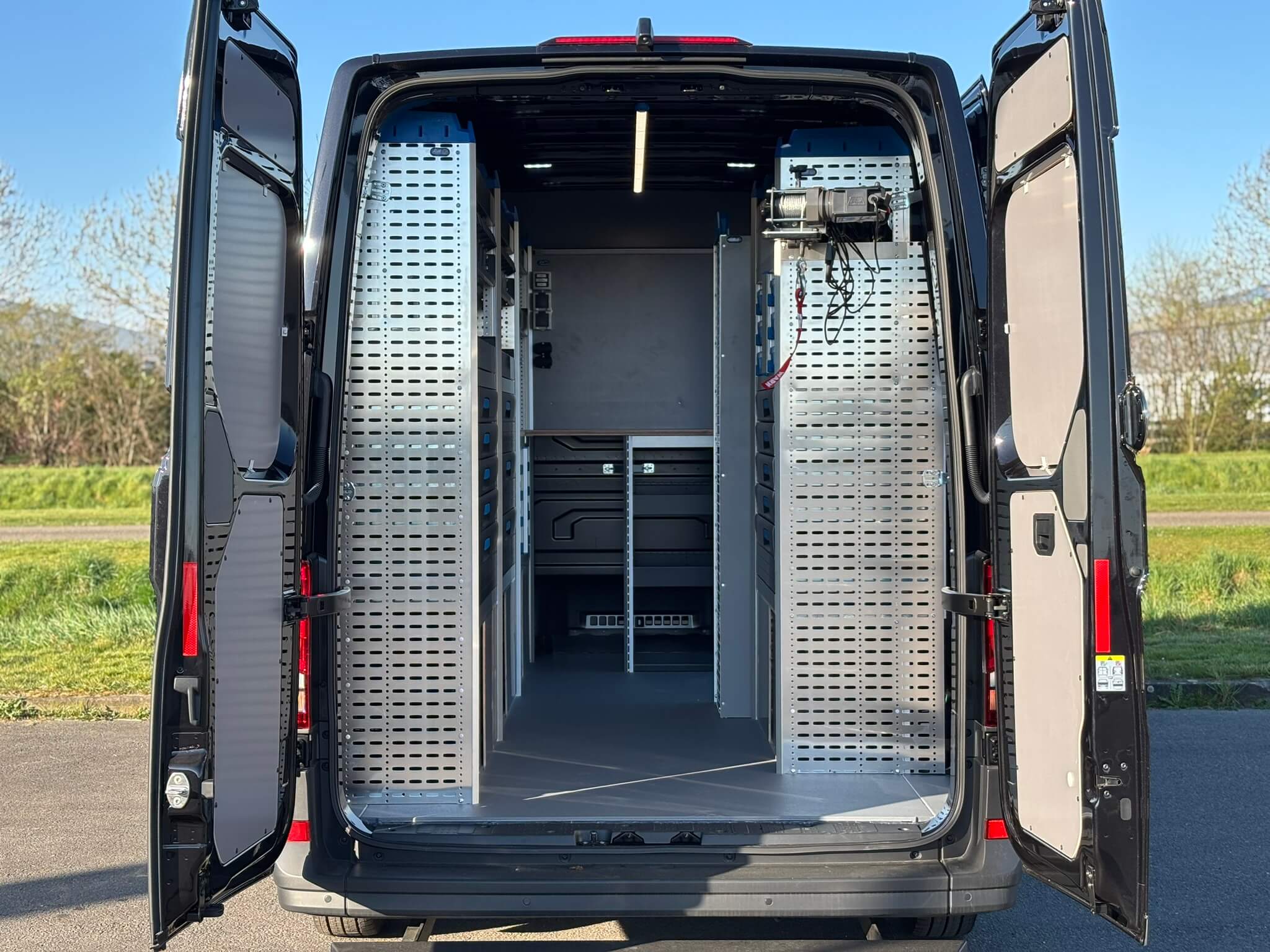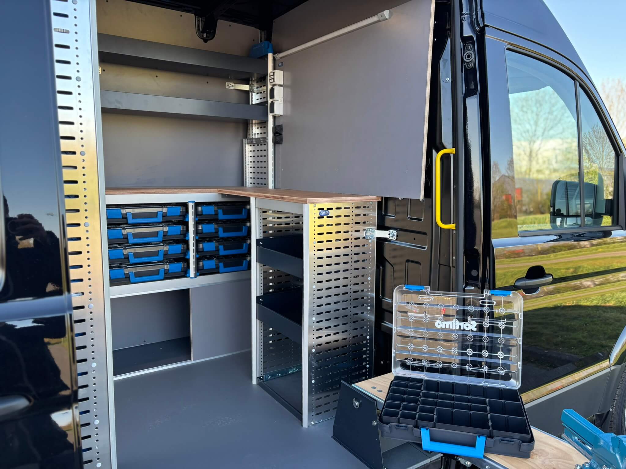 In de laadruimte is gekozen voor een Sortimo bedrijfswageninrichting met opstellingen aan de linkerzijde en voorzijde, een module bij de schuifdeur en een opstelling aan de rechterzijde. Daarmee ontstaat een duidelijke verdeling tussen voorraad, gereedschap en grotere items. Onderin zijn luiken toegepast met maatwerk schuifdeuren, zodat de onderste vakken netjes afsluiten en toch snel toegankelijk blijven.