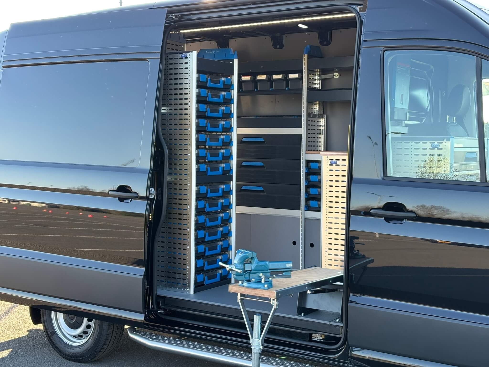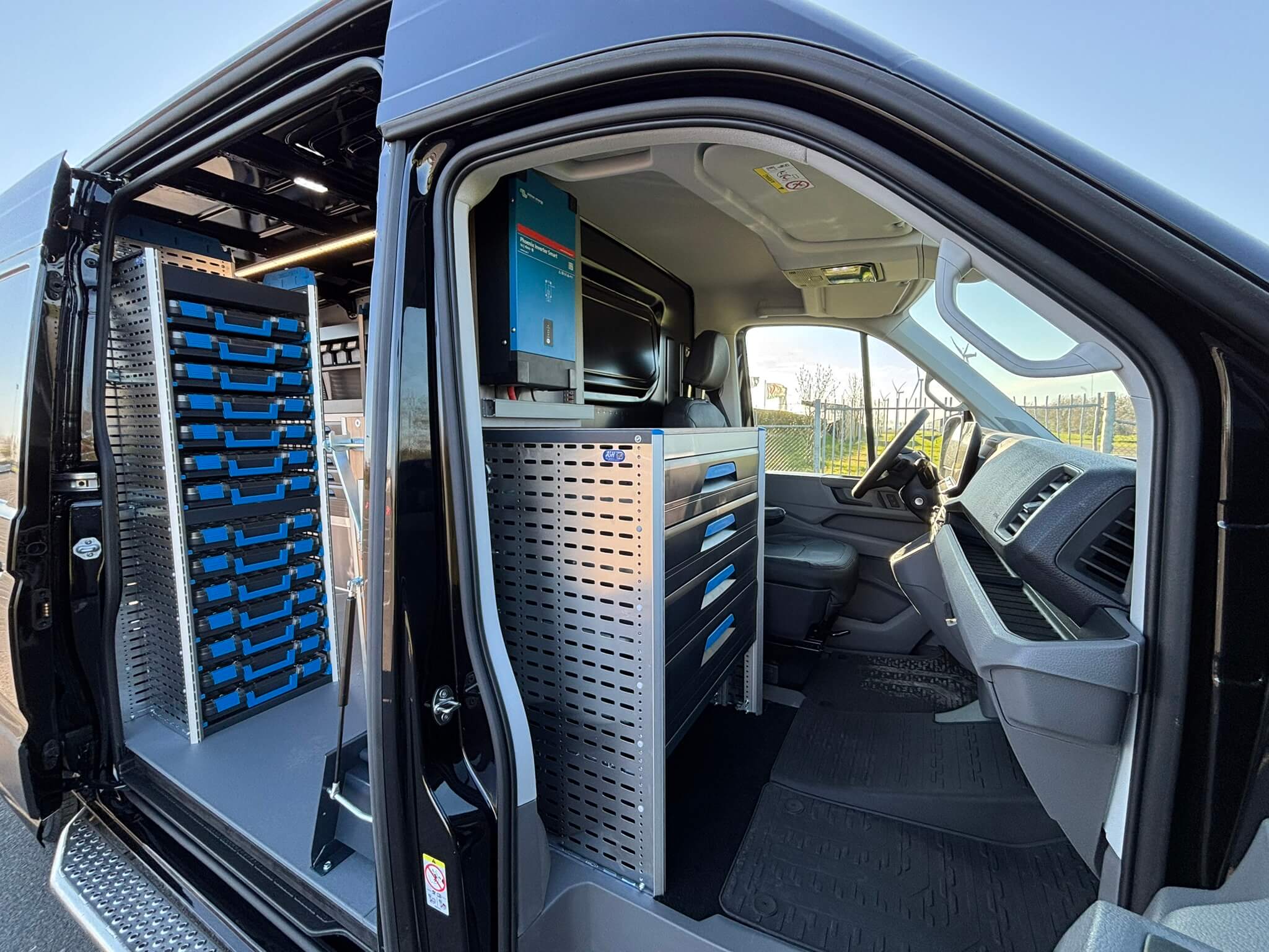 Wat deze Crafter echt onderscheidt, is de inrichting in de cabineruimte. In plaats van de bijrijdersstoel is een extra Sortimo kast geplaatst. Dat levert een vaste, veilige plek op voor gereedschap en onderdelen die je het liefst binnen handbereik houdt of die je netjes gescheiden wilt houden van de laadruimte. Ideaal voor monteurs die vaak korte stops maken en snel willen pakken, wegleggen en weer door.