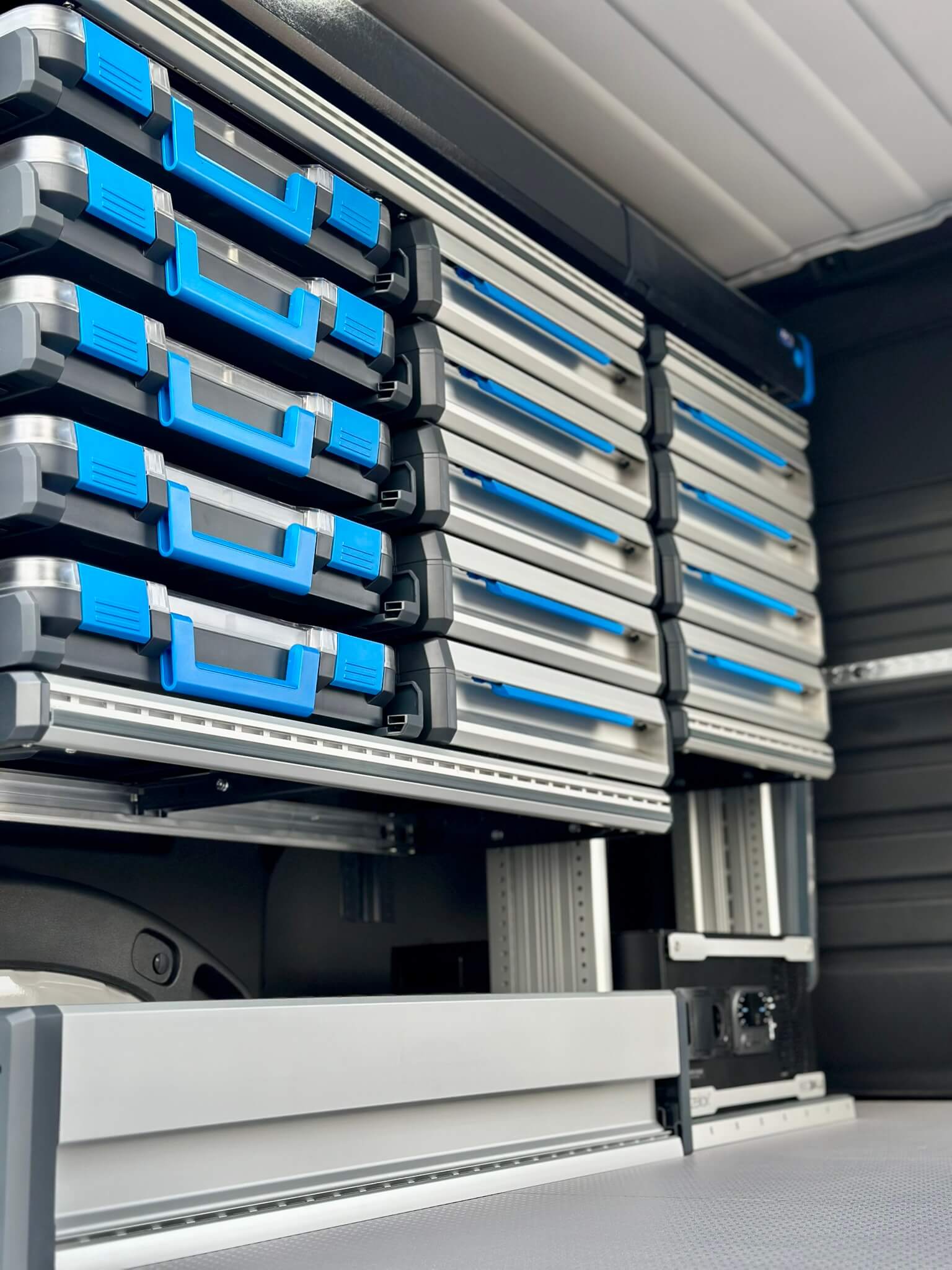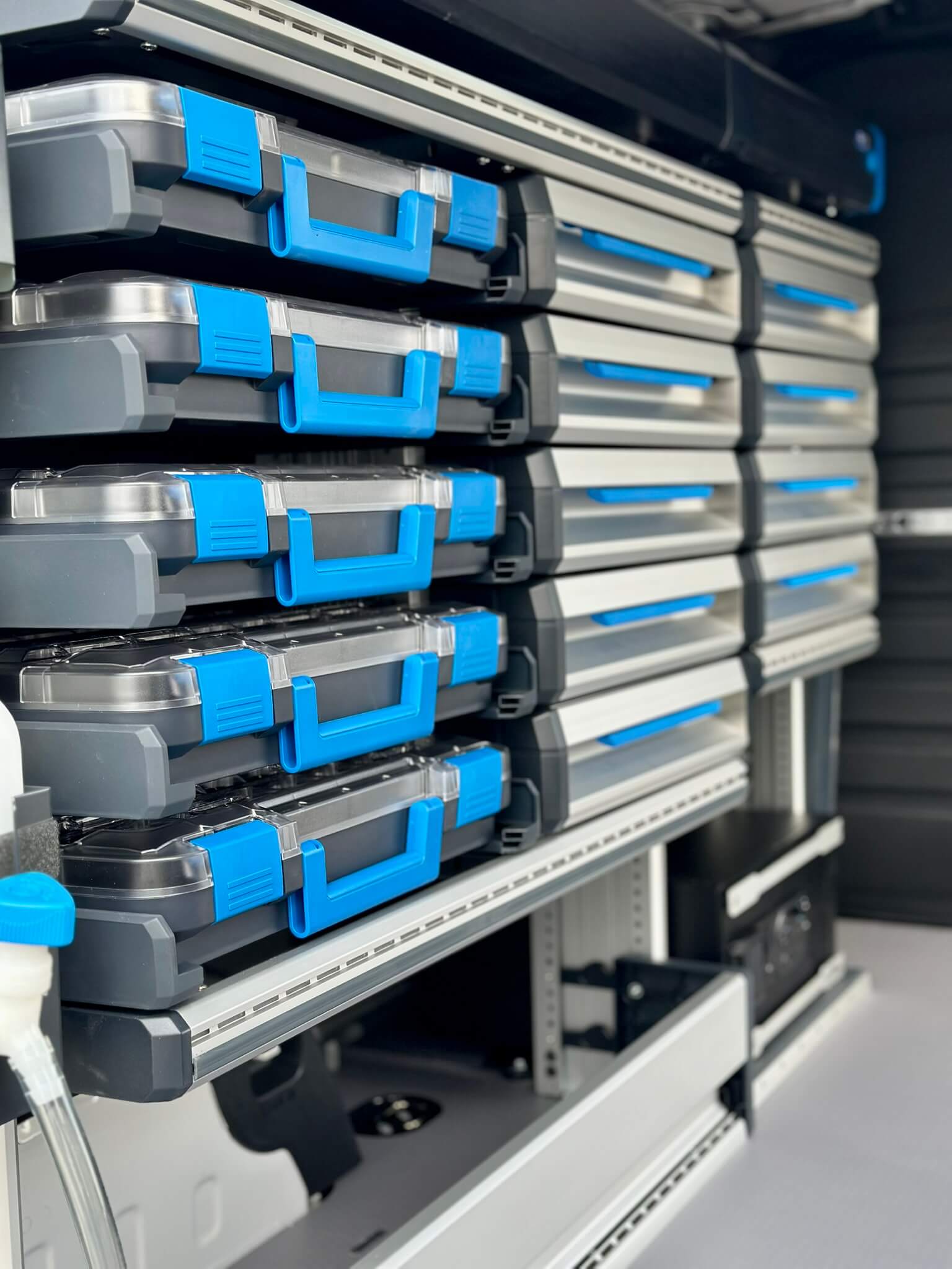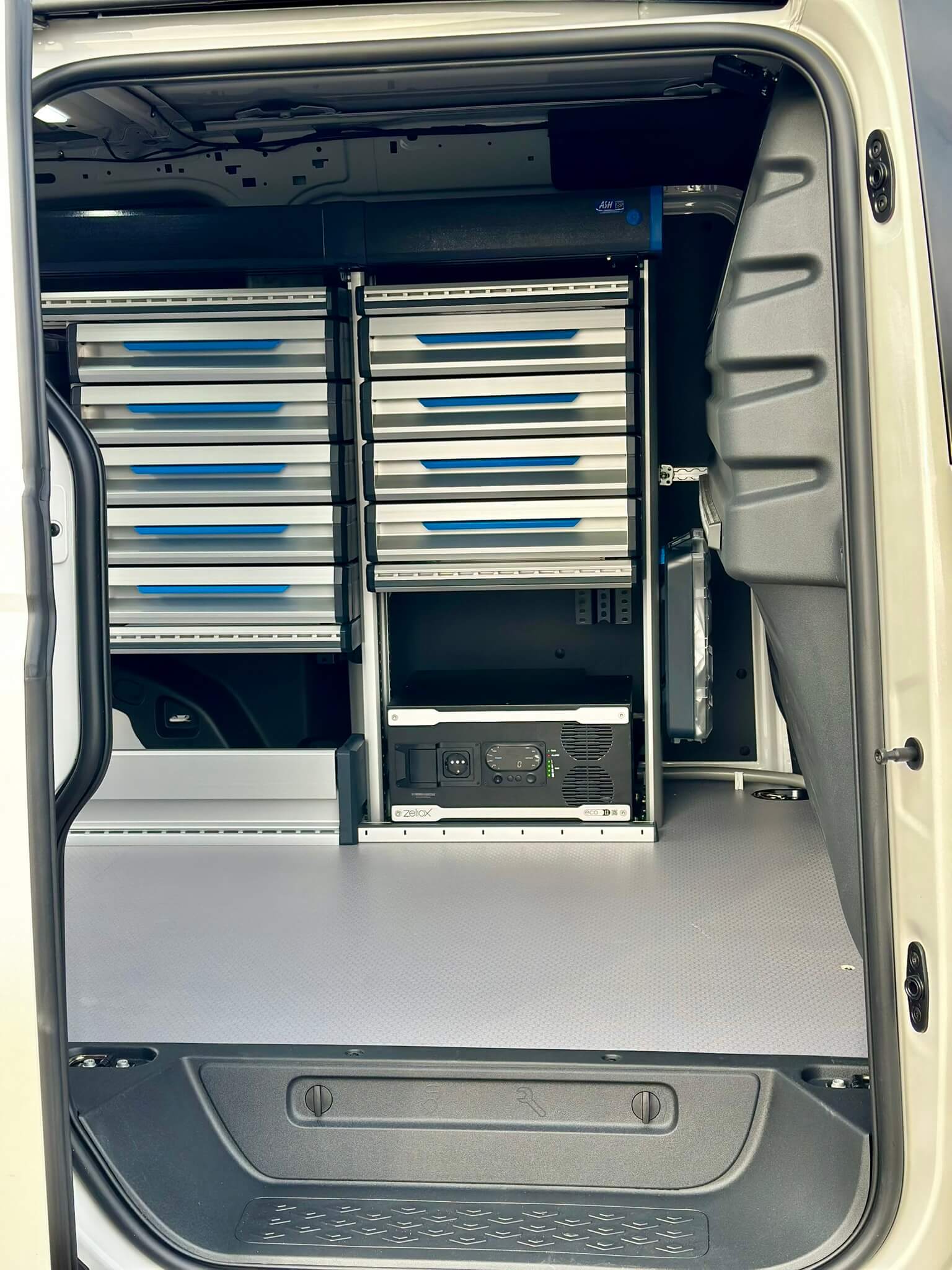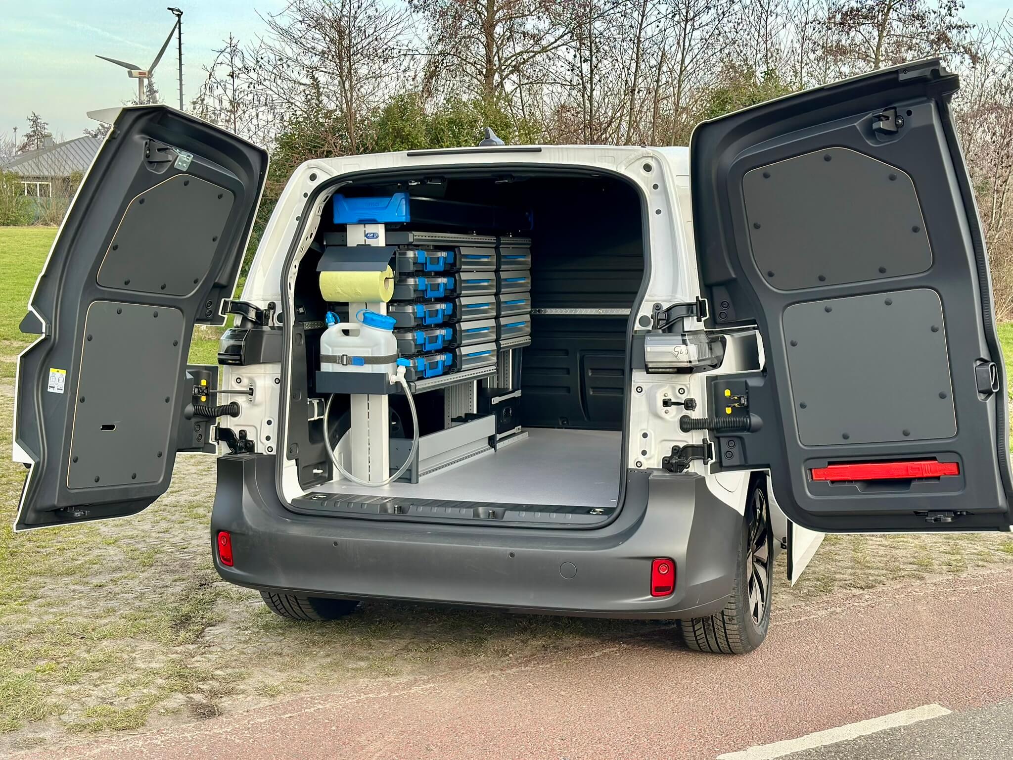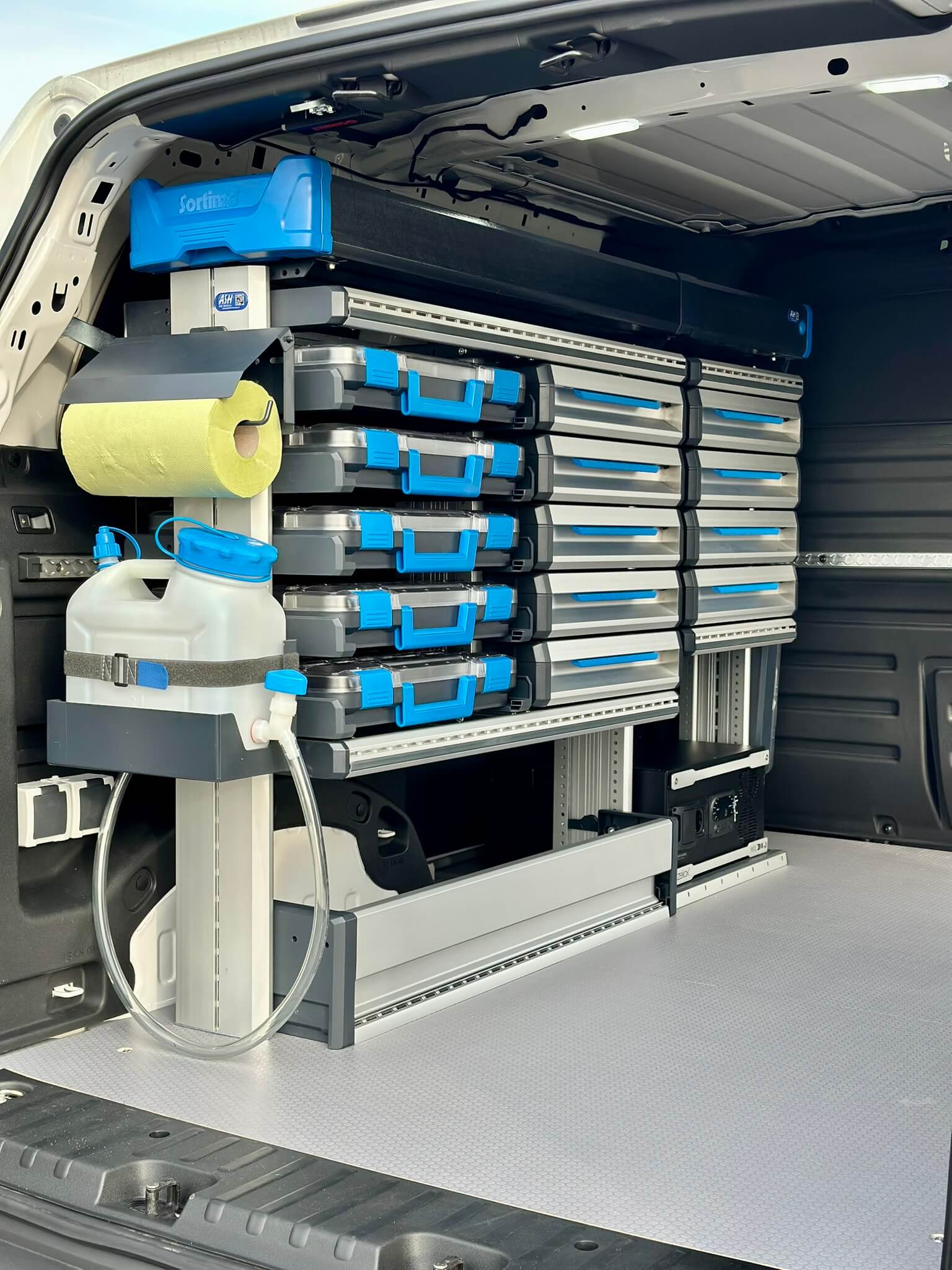 De laadruimte is ingericht met een Sortimo SR5 opstelling aan de linkerzijde. Deze modulaire inrichting is licht van gewicht en optimaal in te delen. De schuiflades zijn voorzien van antislipmatten en bieden een overzichtelijke opslag van gereedschap en materialen. Er is daarnaast nog een watertapset gemonteerd in de laadruimte.