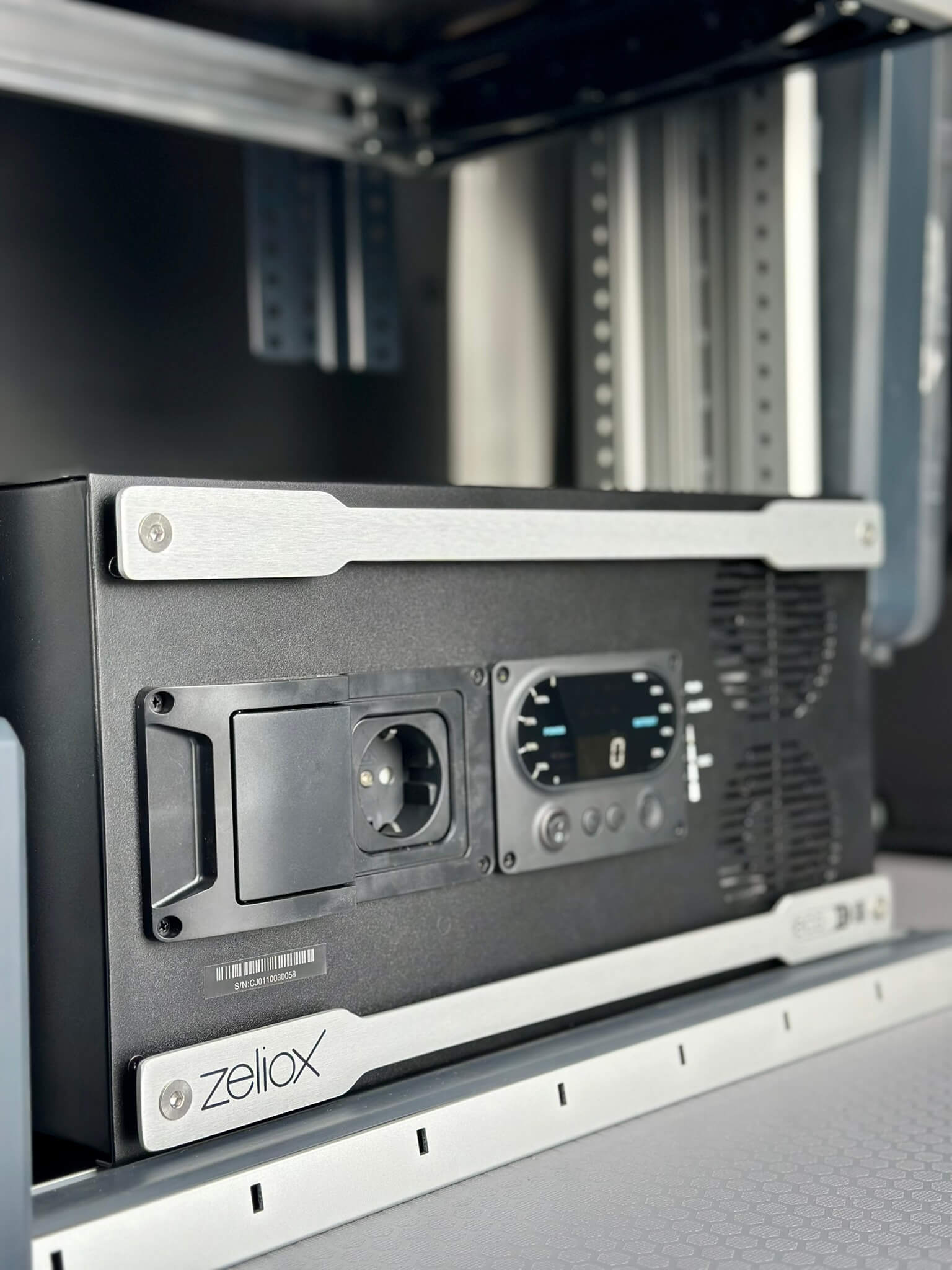 Om onderweg te kunnen werken, is de Volkswagen ID. Buzz voorzien van een Zeliox stroomvoorziening (2000W). Deze is netjes weggewerkt aan de voorzijde van de laadruimte. Daarnaast is een wandcontactdoos geplaatst in de laadruimte, en kan de stroomvoorziening worden opgeladen via een walstroomaansluiting.