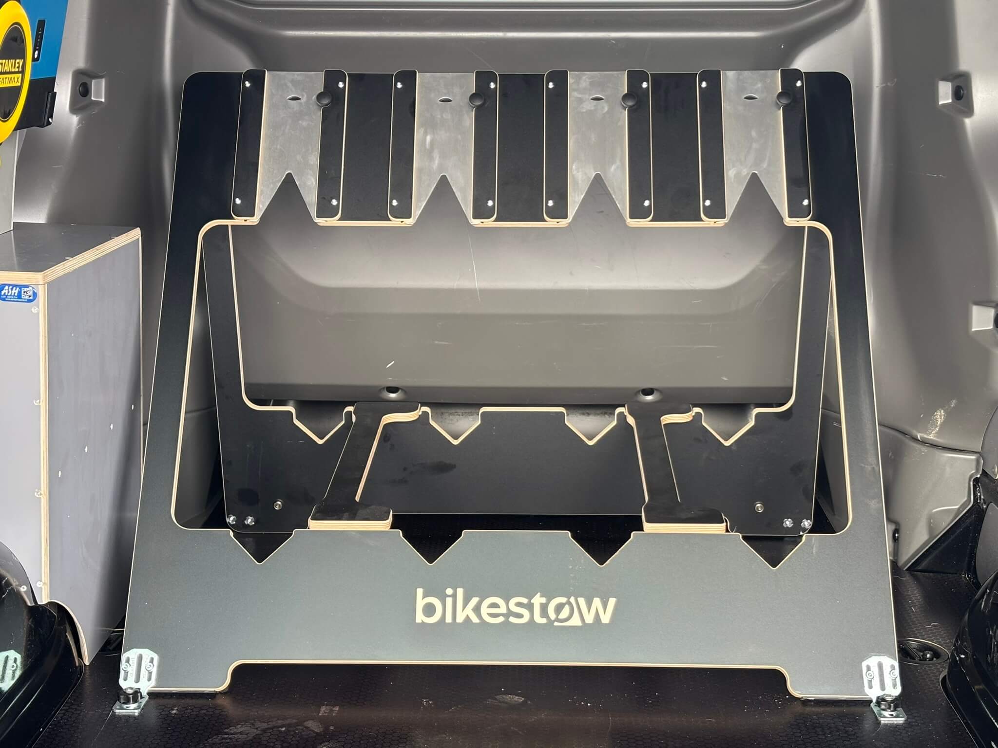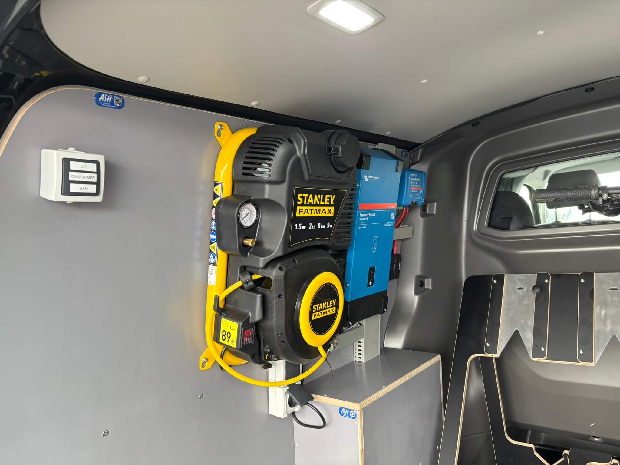 Om het vervoer van fietsen veilig en stabiel te laten verlopen, is in de vloer een stevige fietsenhouder gemonteerd. Deze is zo geplaatst dat hij eenvoudig te demonteren is wanneer de laadruimte anders benut moet worden. Boven deze houder is een Stanley Fatmax compressor bevestigd tegen de tussenwand – ideaal voor het oppompen van banden of het aandrijven van luchtgereedschap.