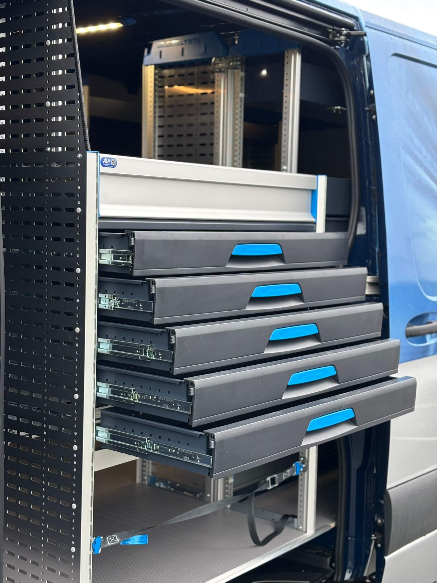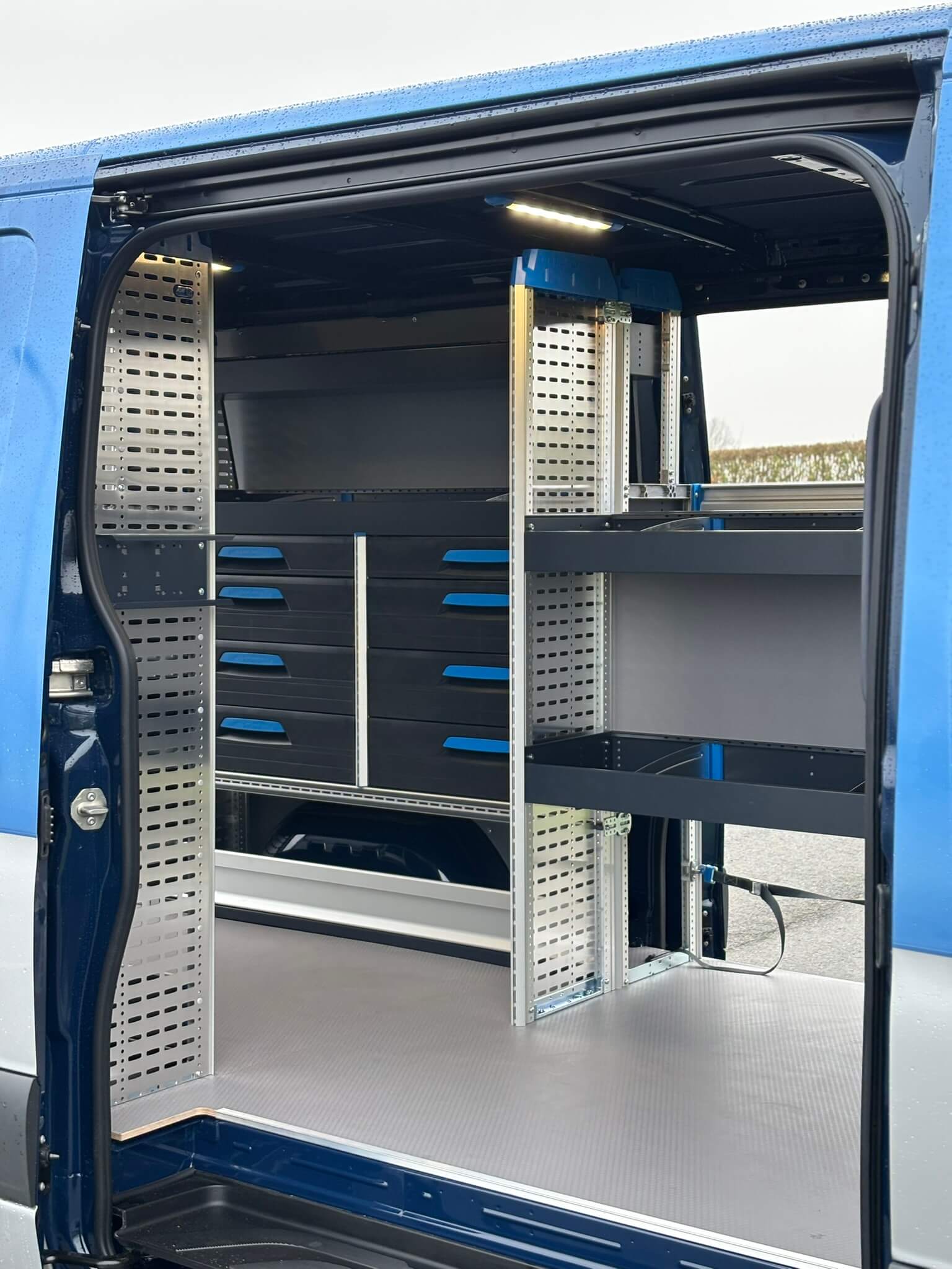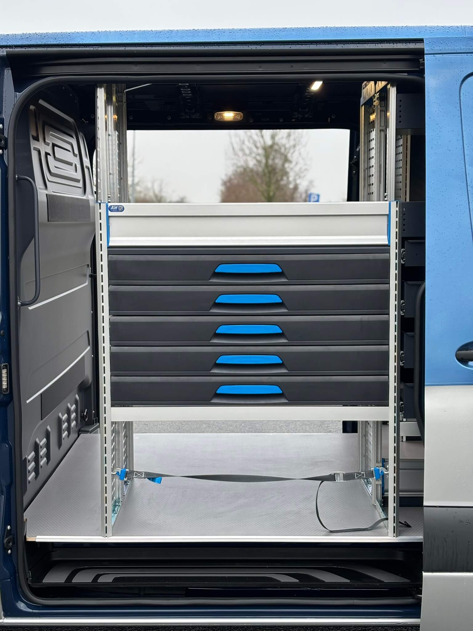Voor Maha Explora, specialist in werkplaatsinrichting zoals hefbruggen, remmentestbanken en bandenmachines, realiseerden we de inrichting van een Mercedes-Benz Sprinter. Een praktische, overzichtelijke inrichting was hierbij essentieel, zodat hun monteurs op locatie efficiënt kunnen werken met alle benodigde onderdelen en gereedschappen direct binnen handbereik.